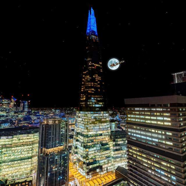 Santa Claus passing The Shard on Christmas Eve in London, UK. ©DeTours360